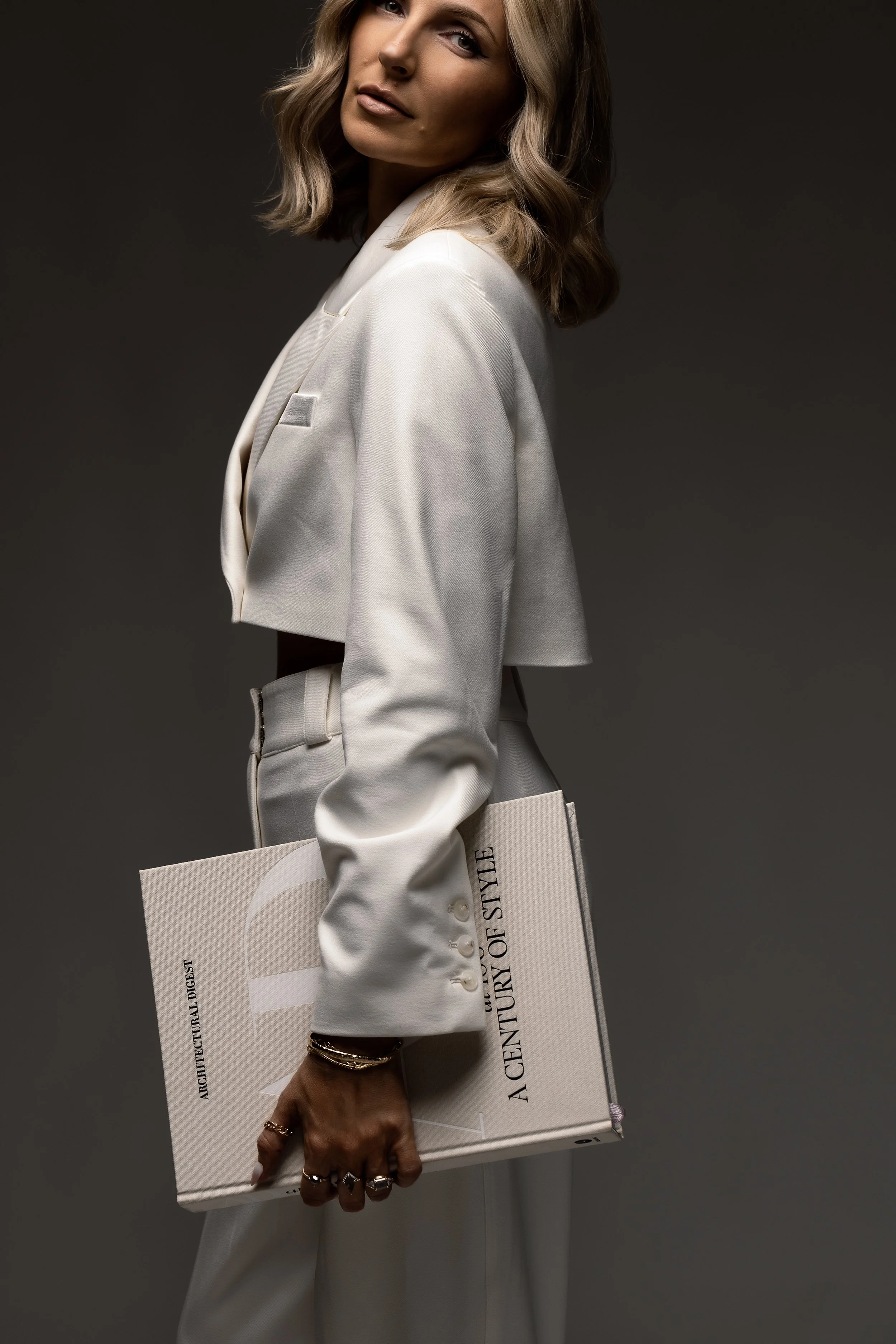 Fashionable woman wearing sunglasses, gold jewelry, and a white blazer, posing in a minimalist setting with neutral tones.