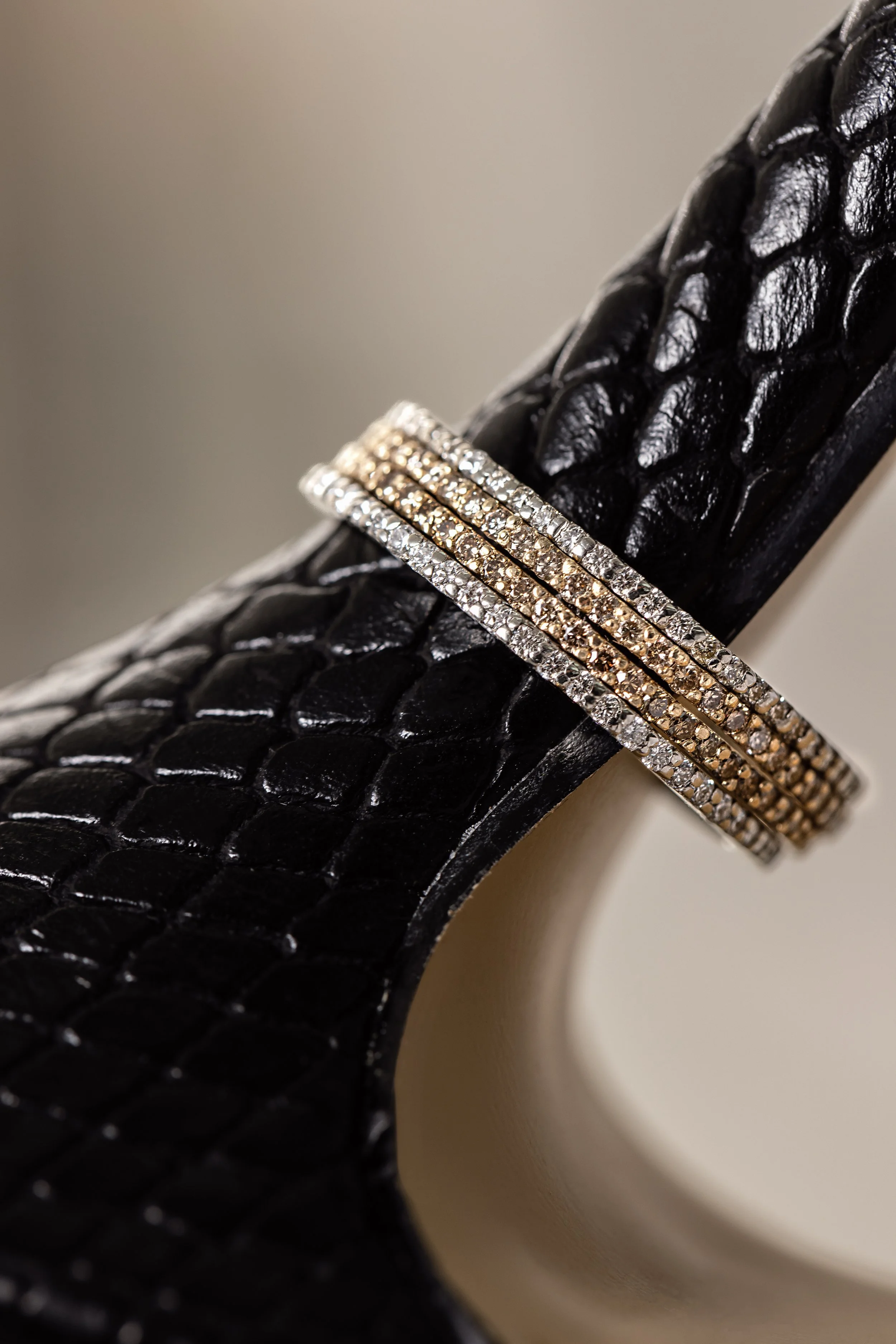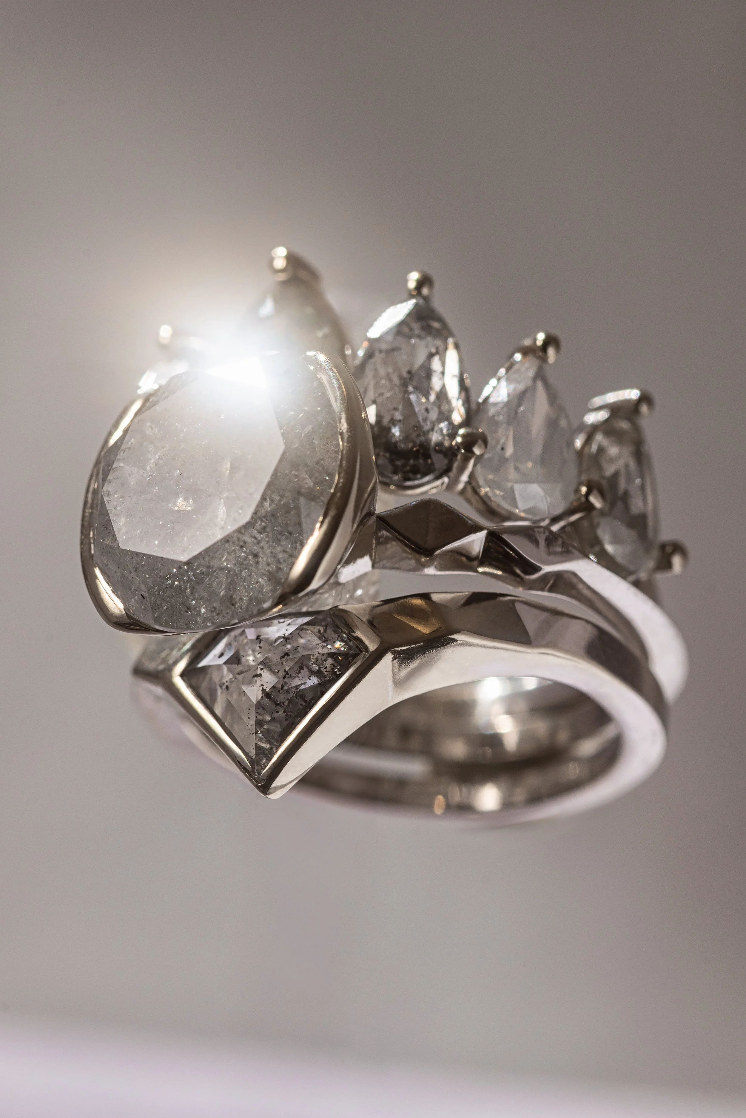 Close-up of a person wearing multiple diamond rings on fingers, with a focus on the jewelry.