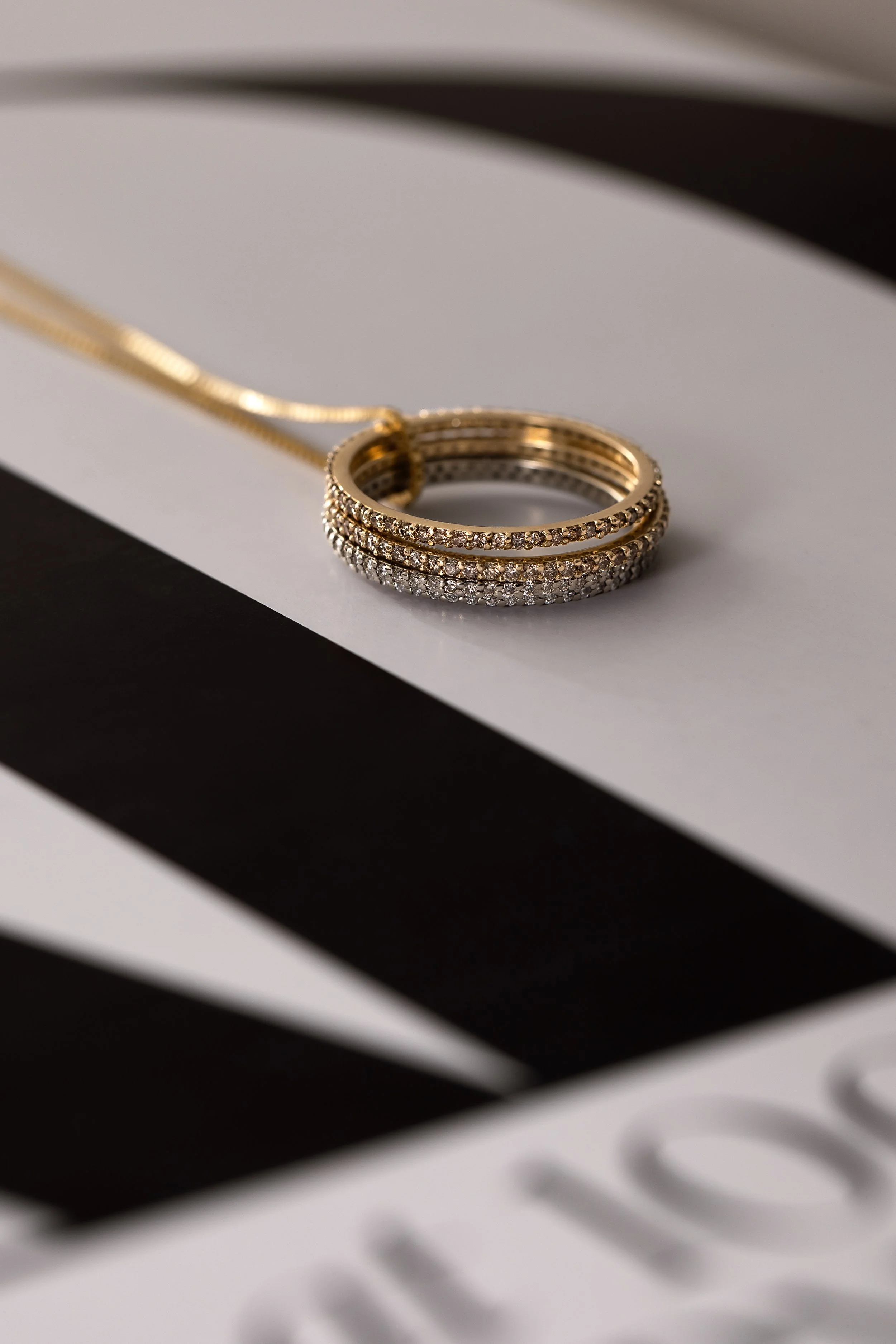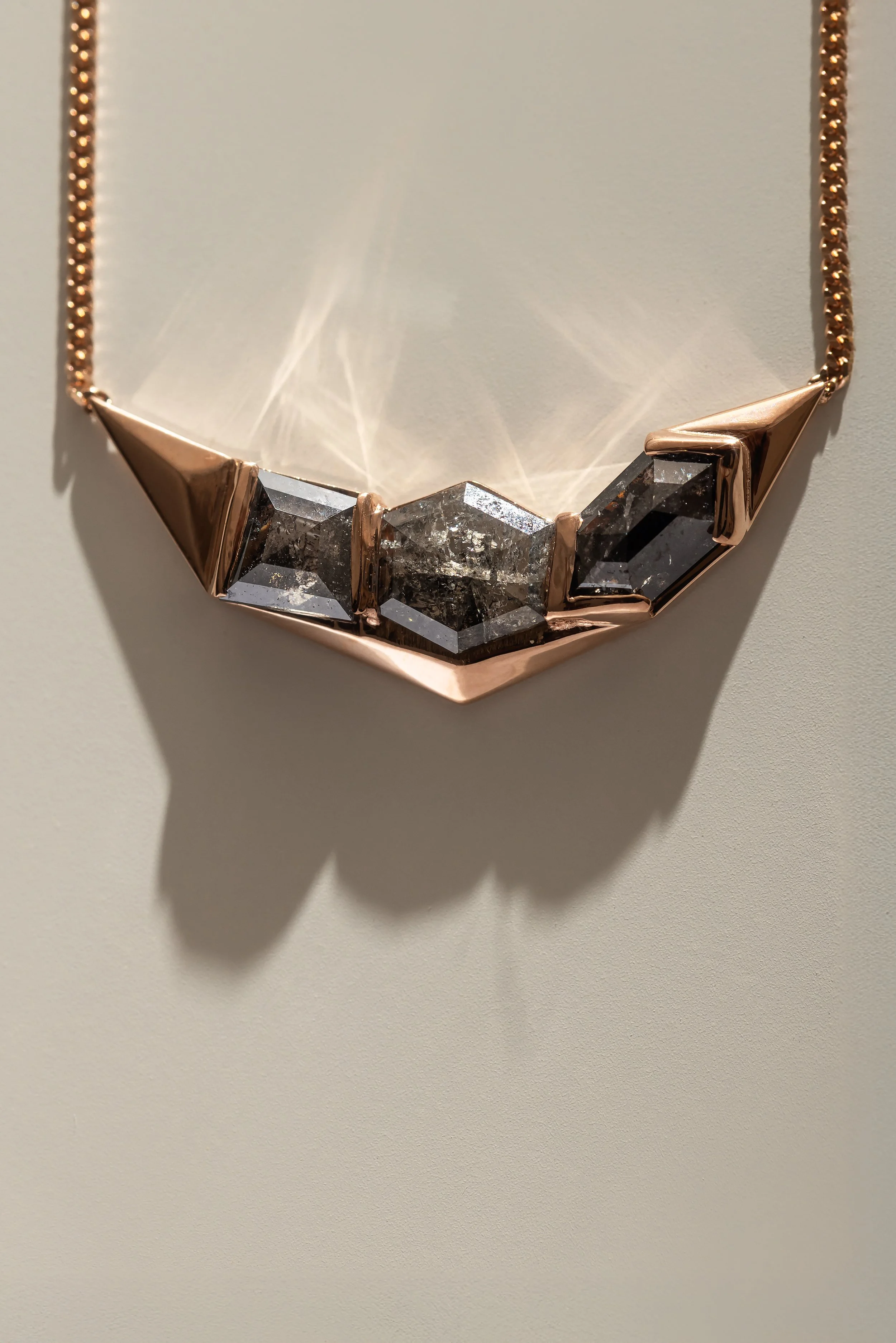 A gold pendant with a geometric design on a textured white and gray background.
