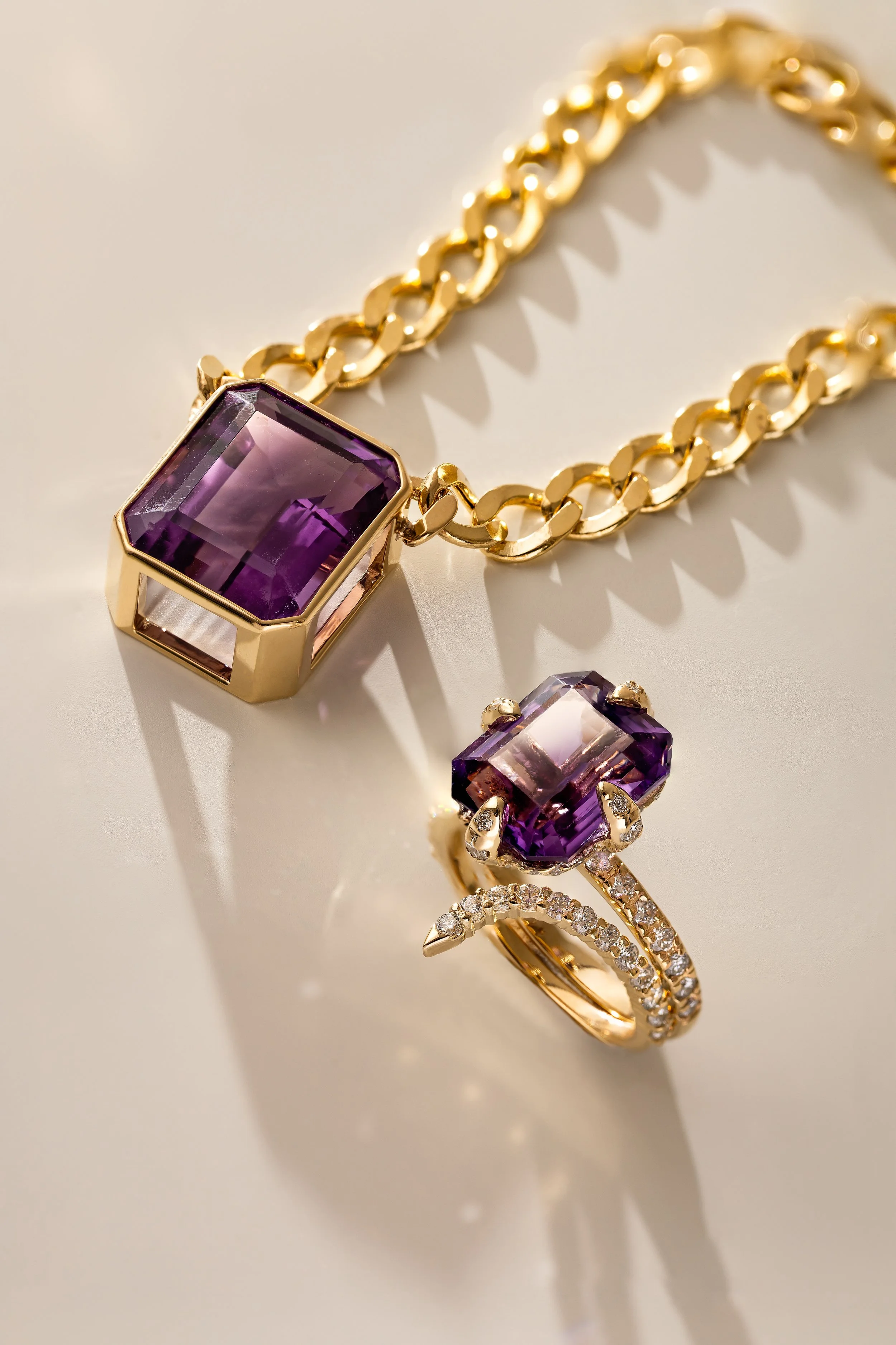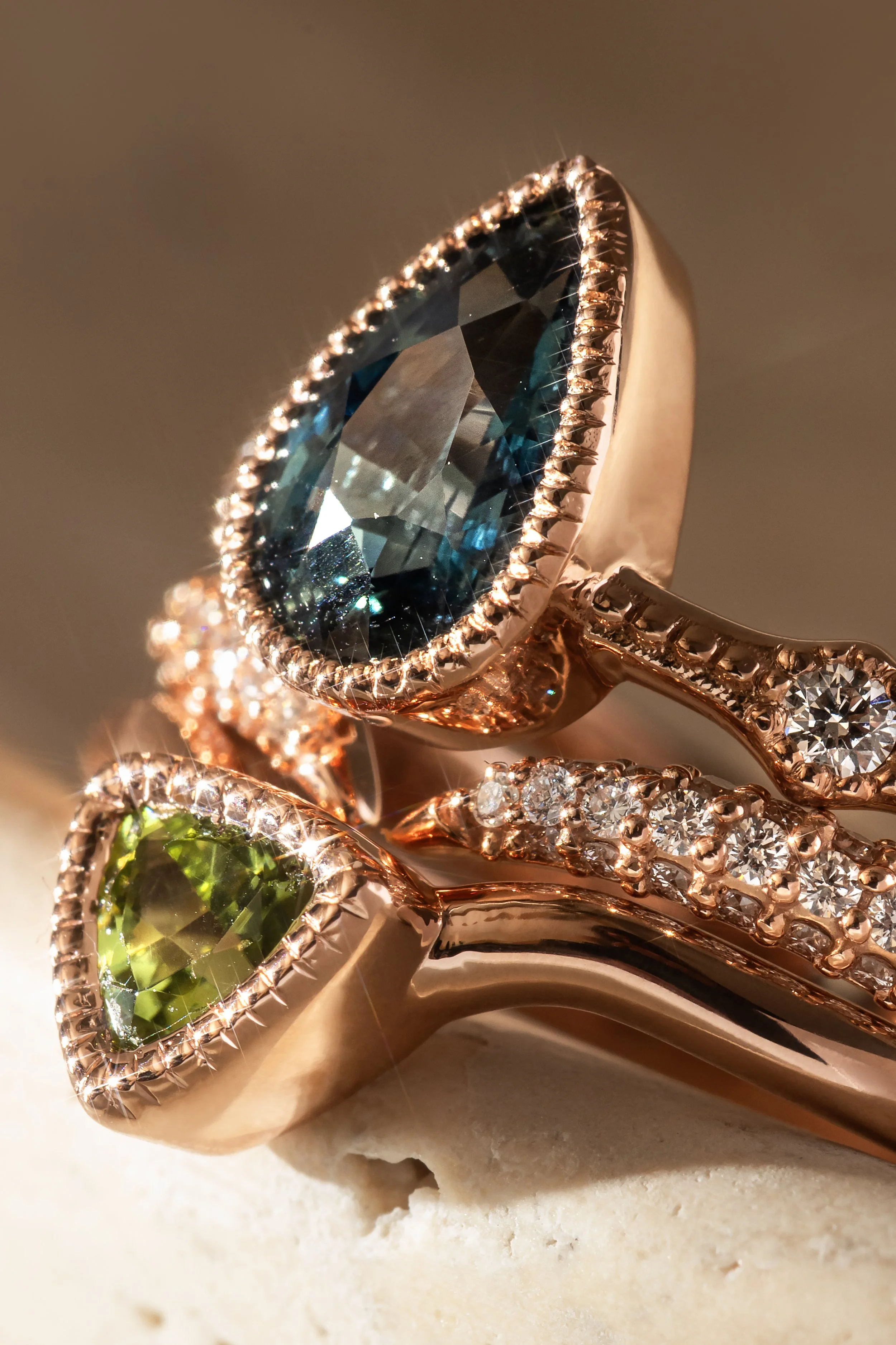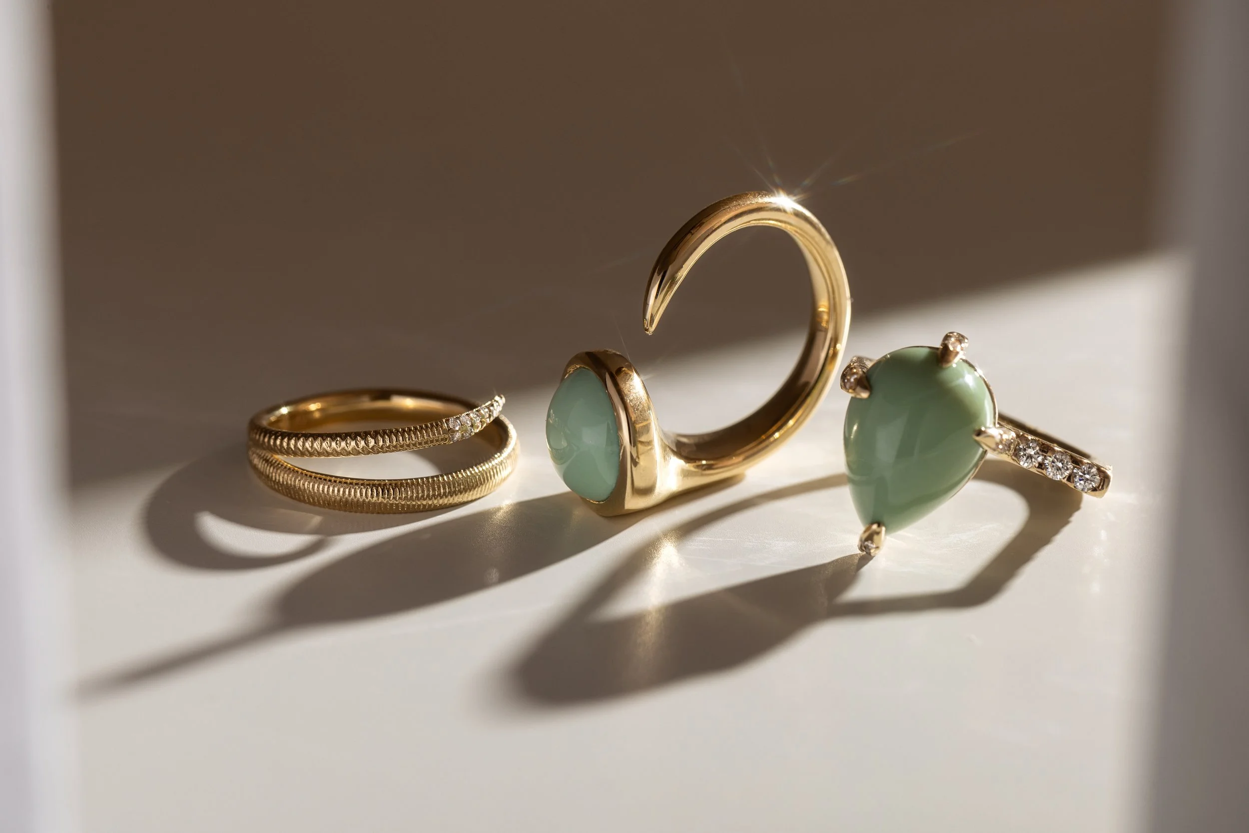 Gold rings with rectangular gemstones on a textured surface