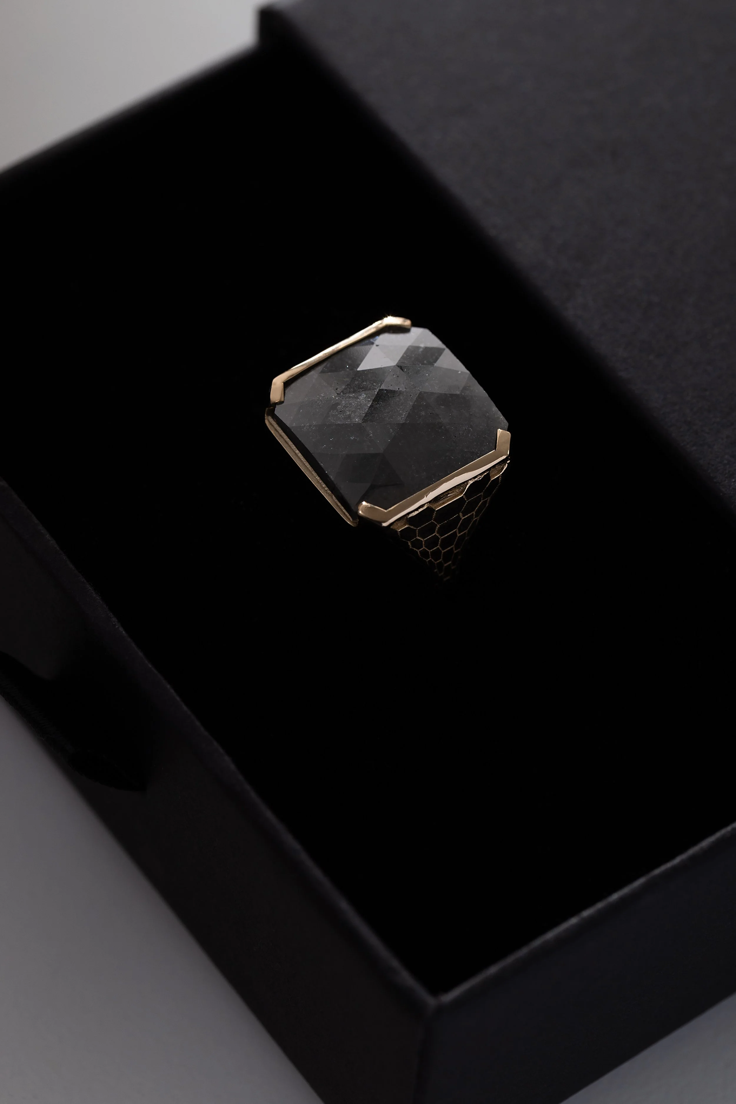 Gold ring with a rectangular black gemstone, featuring a textured band against a neutral background.