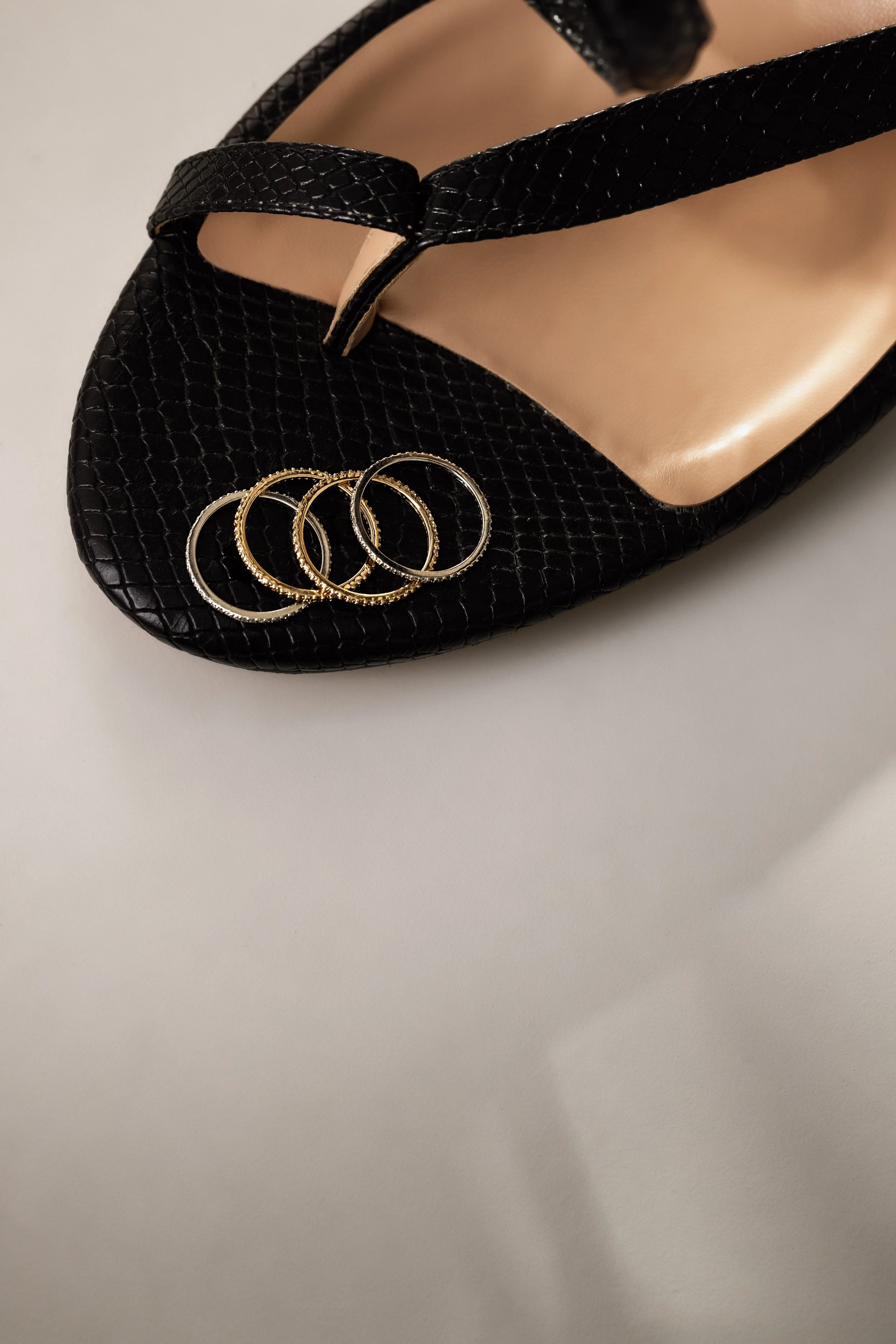 Three gold hoop earrings of varying sizes on a light surface with shadow play.