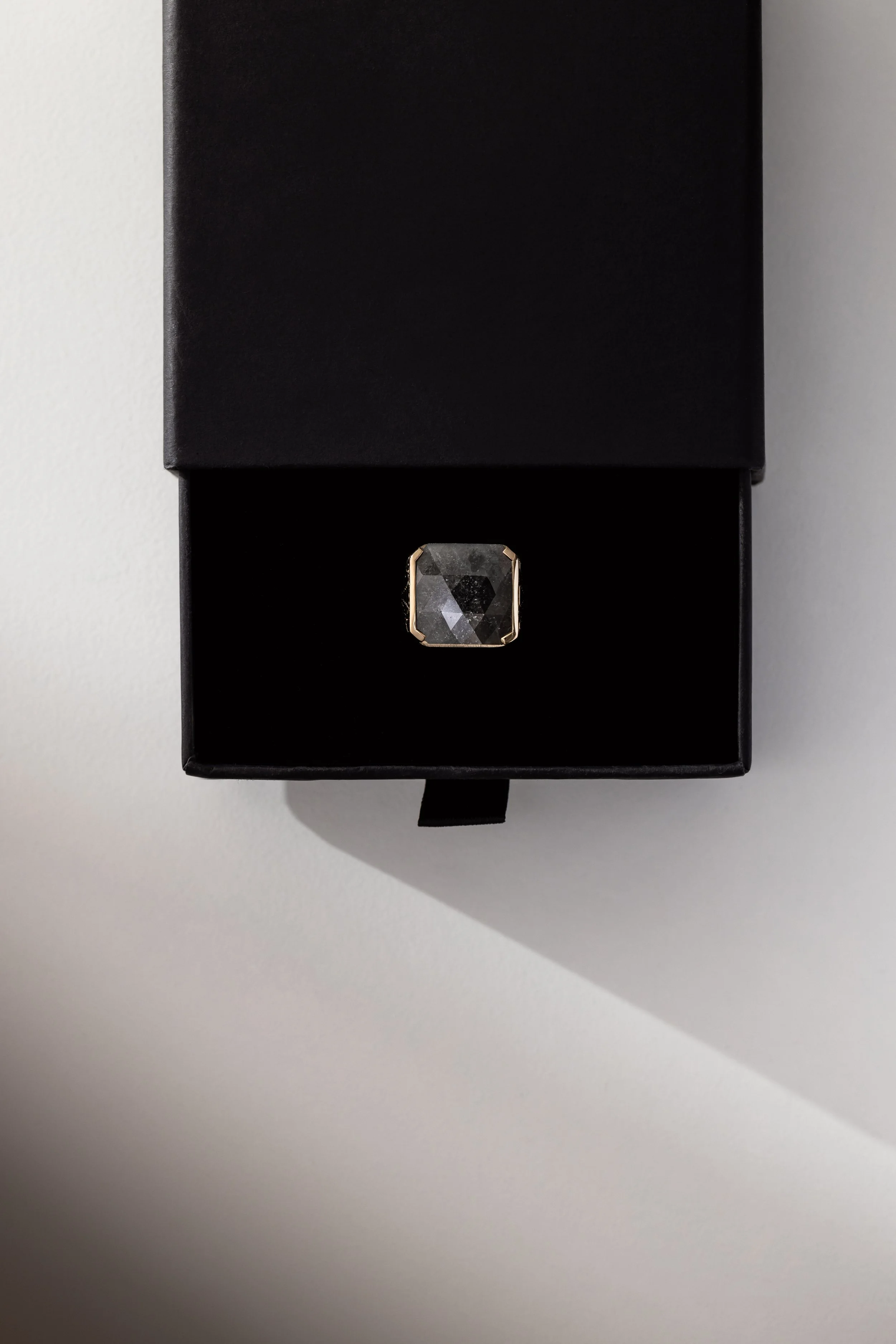 Gold ring with two hexagonal gray gemstones against a neutral background.