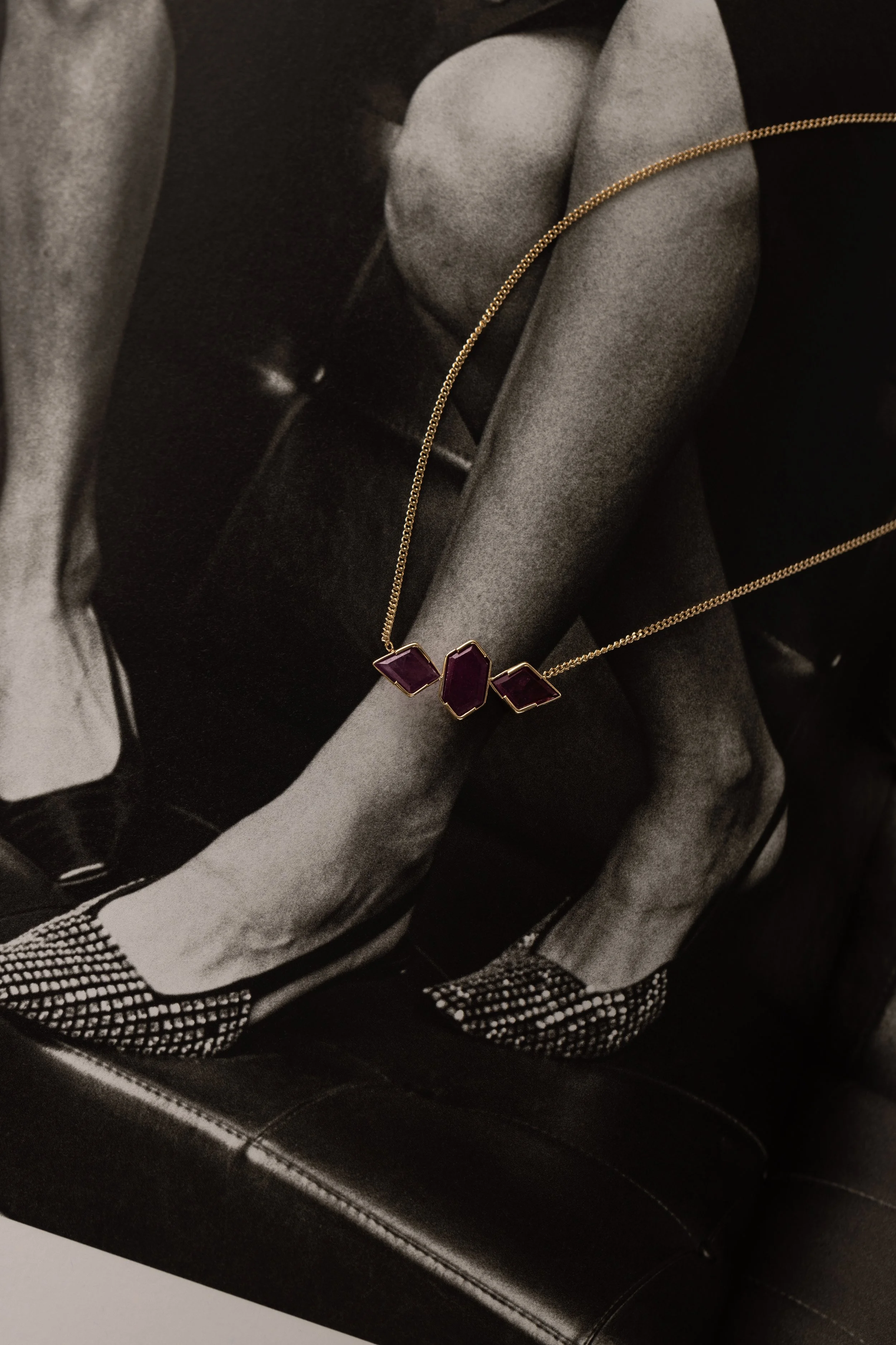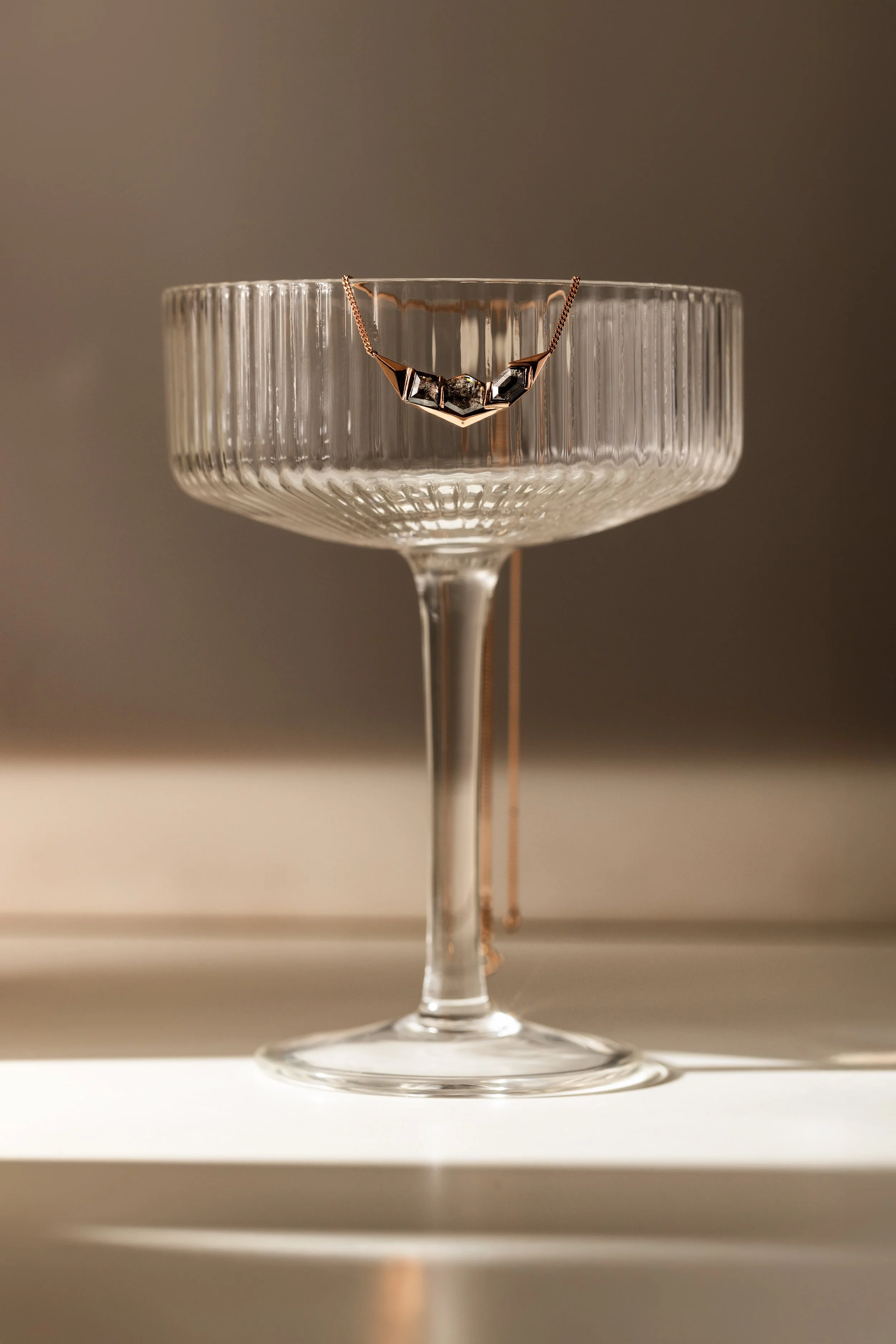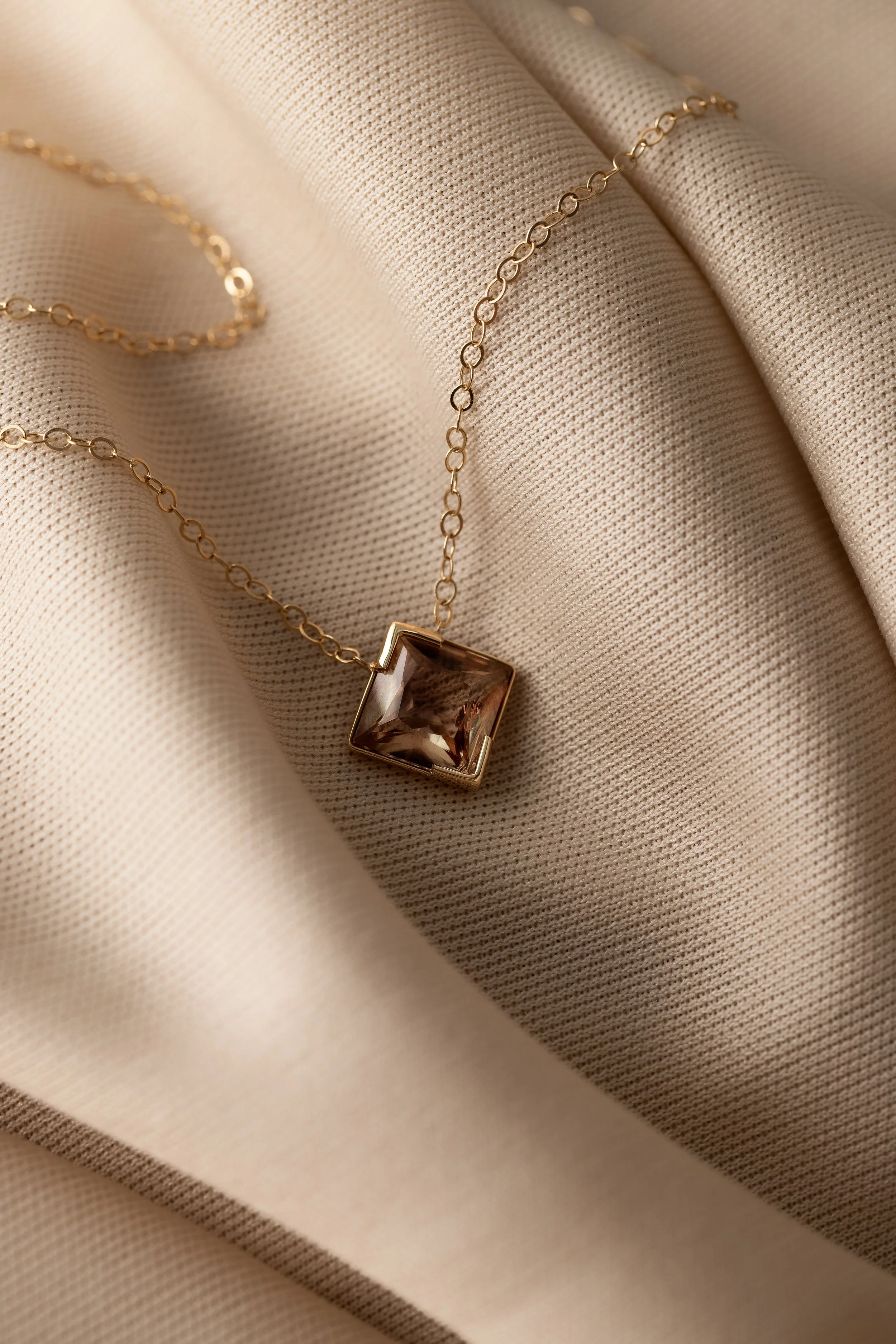 Minimalist necklace with a geometric pendant on a gray surface
