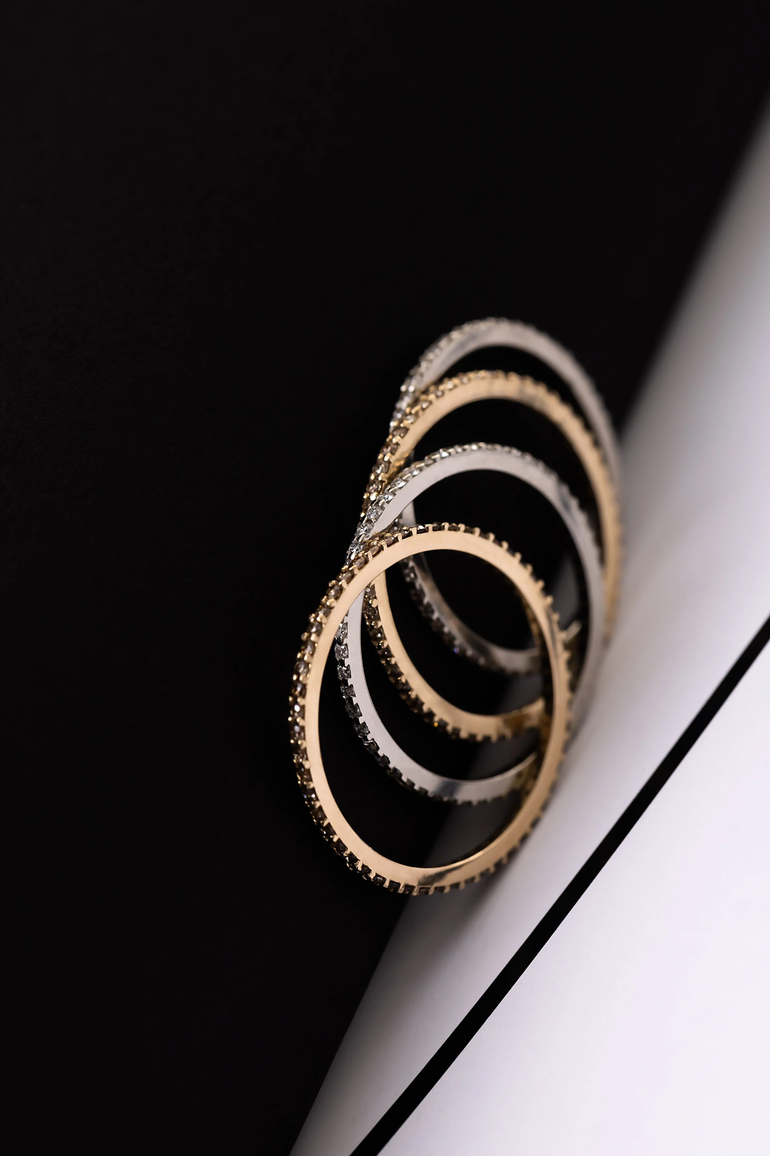 Black and white photo featuring silver jewelry including rings and hoop earrings placed on black and white printed portraits of a person.