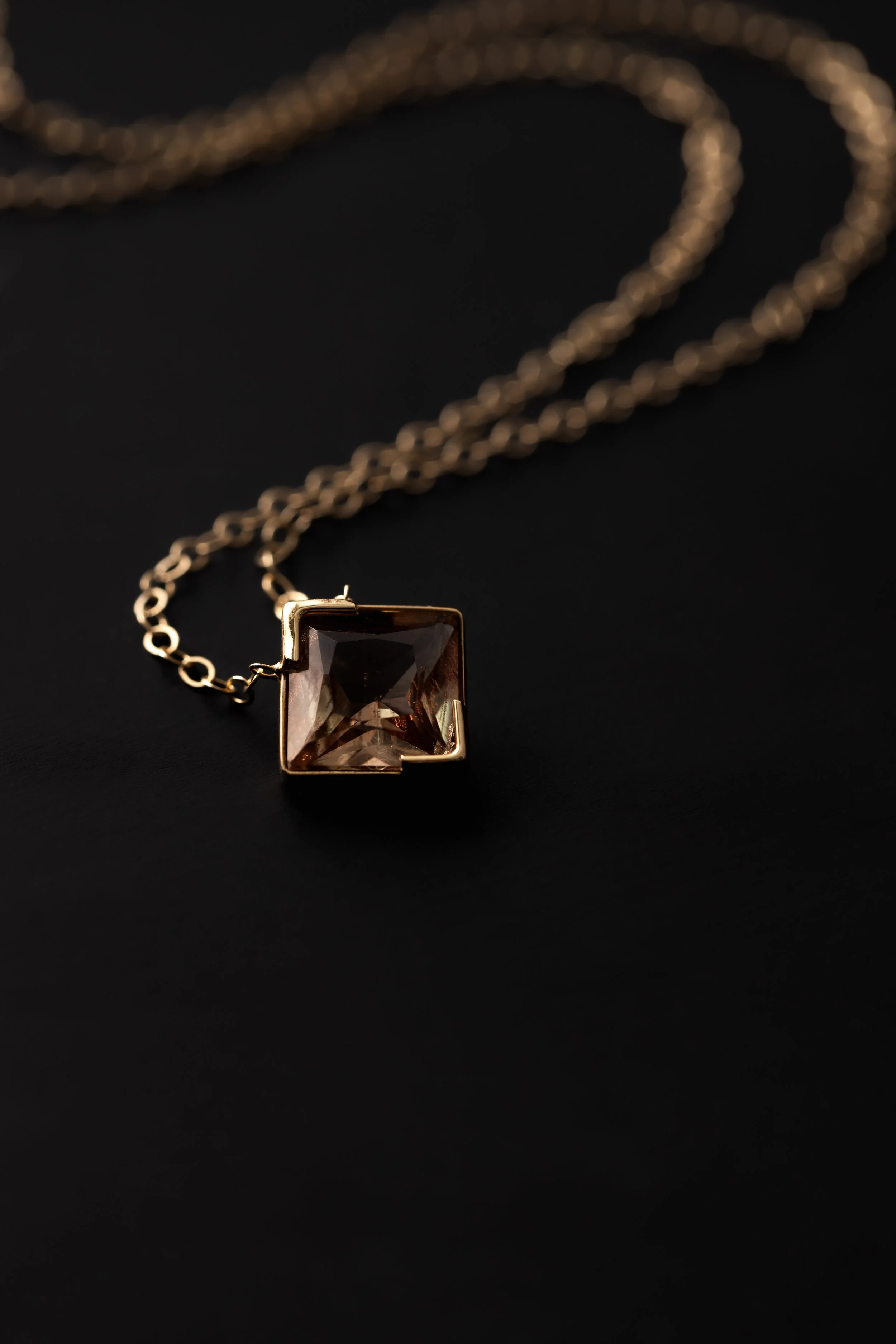 Gold chain necklace with a clear gemstone pendant against a black background.