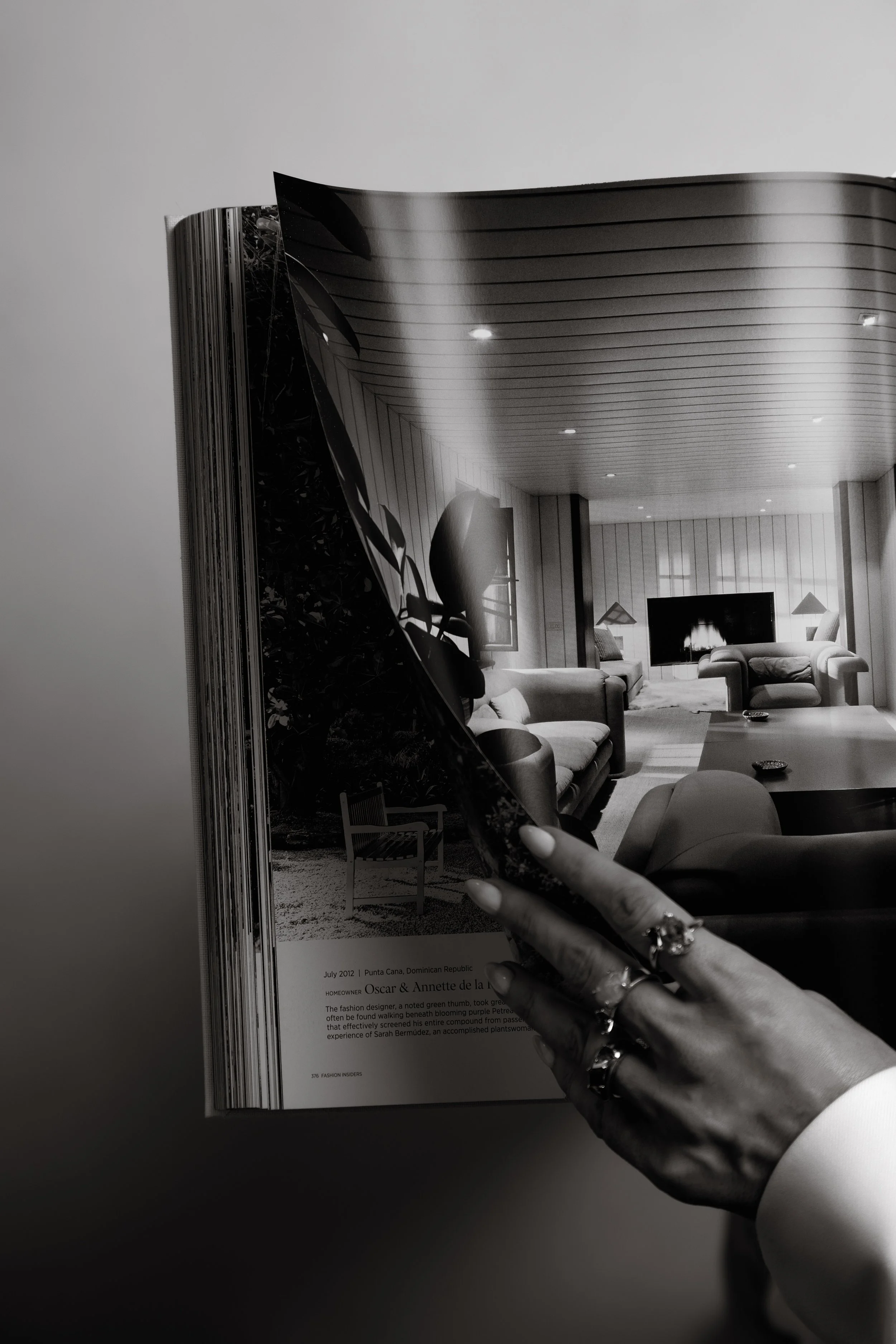 Black and white portrait of a woman wearing jewelry, including necklaces, earrings, and rings. She has a calm expression and her hand is raised near her face.