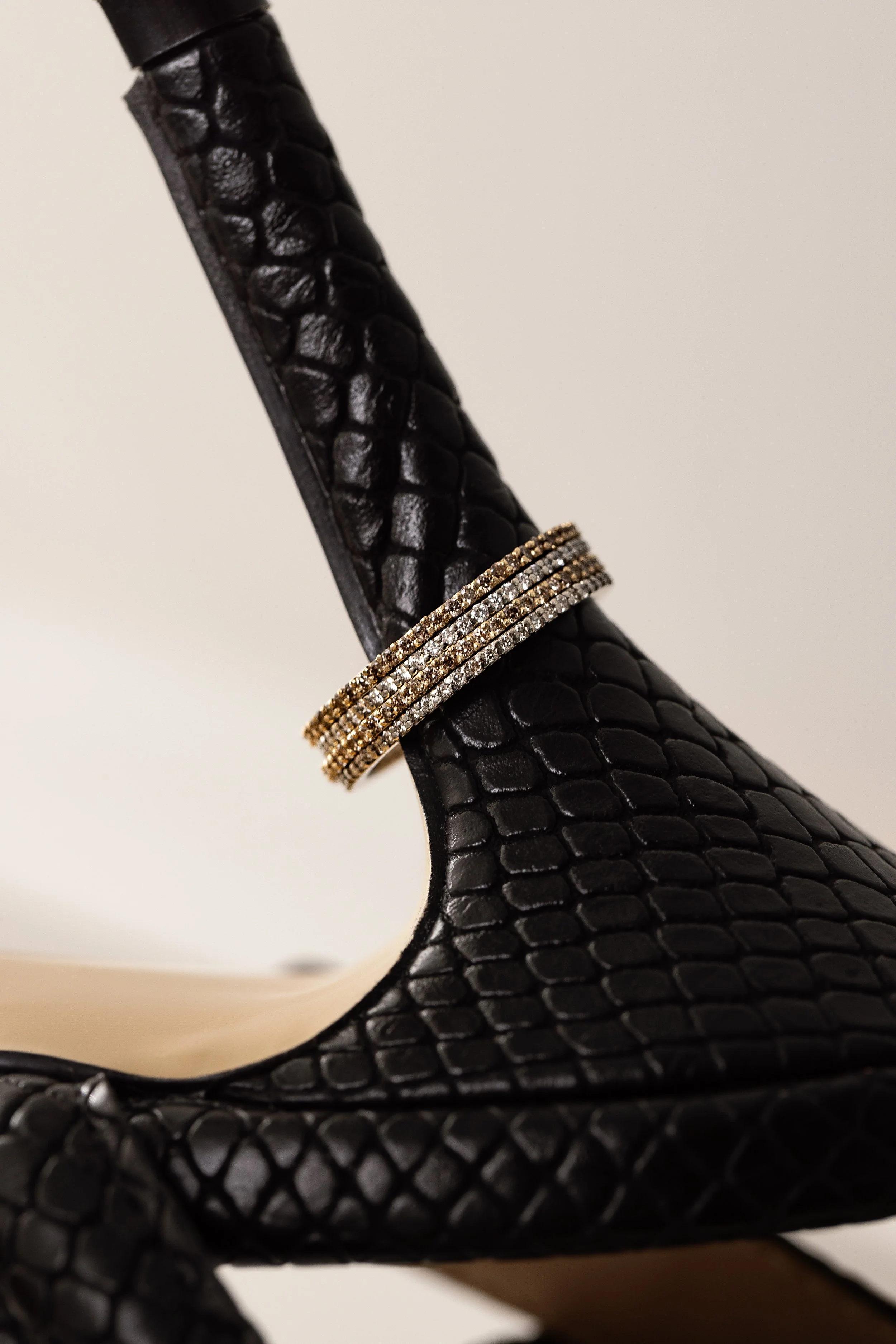Double exposure image of a woman in a black outfit with gold accents, wearing multiple rings and a gold bracelet, with eyes closed and hand near face.