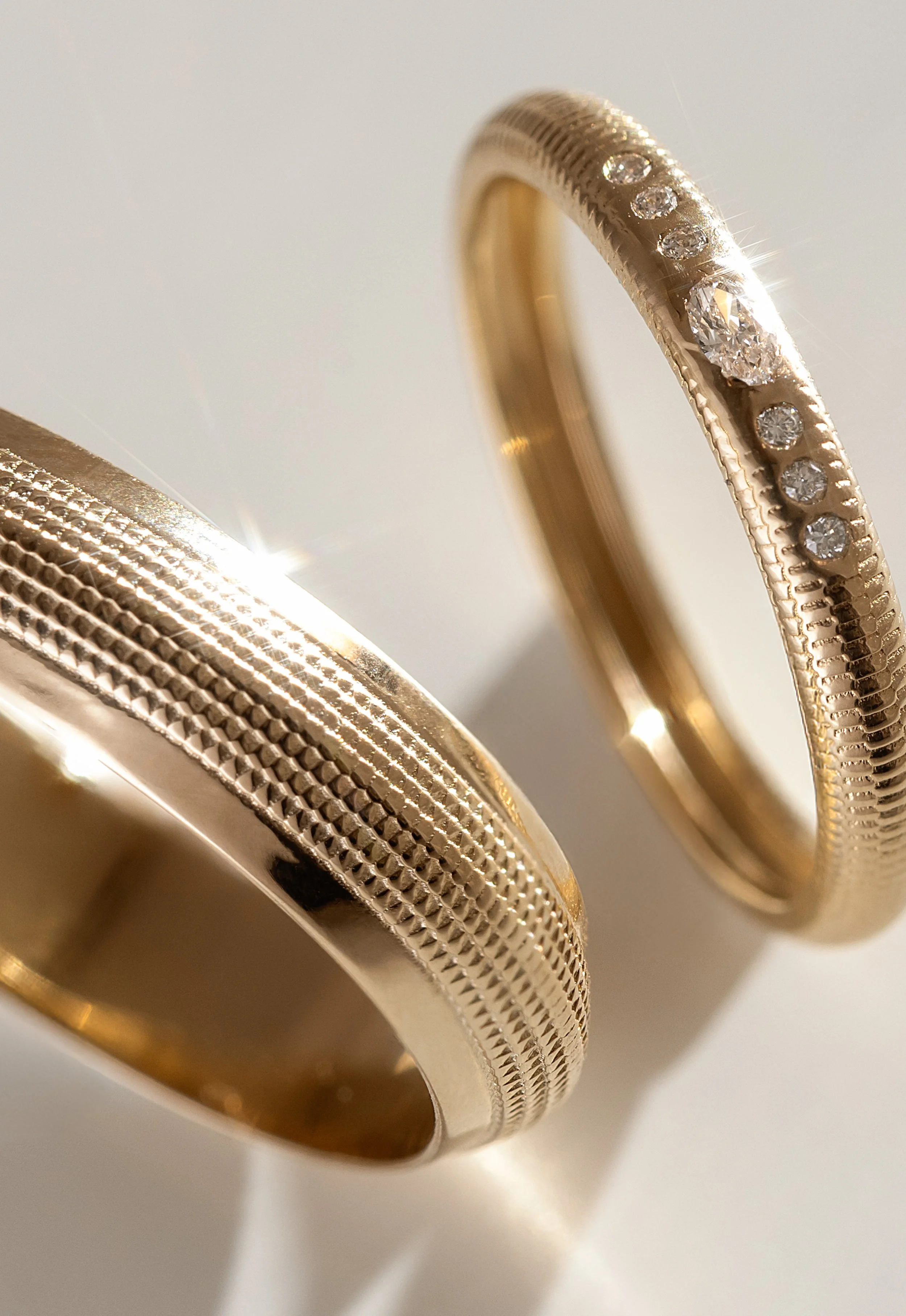 Two gold rings on a reflective surface, one with a twisted design and the other with a smooth, spiral pattern.