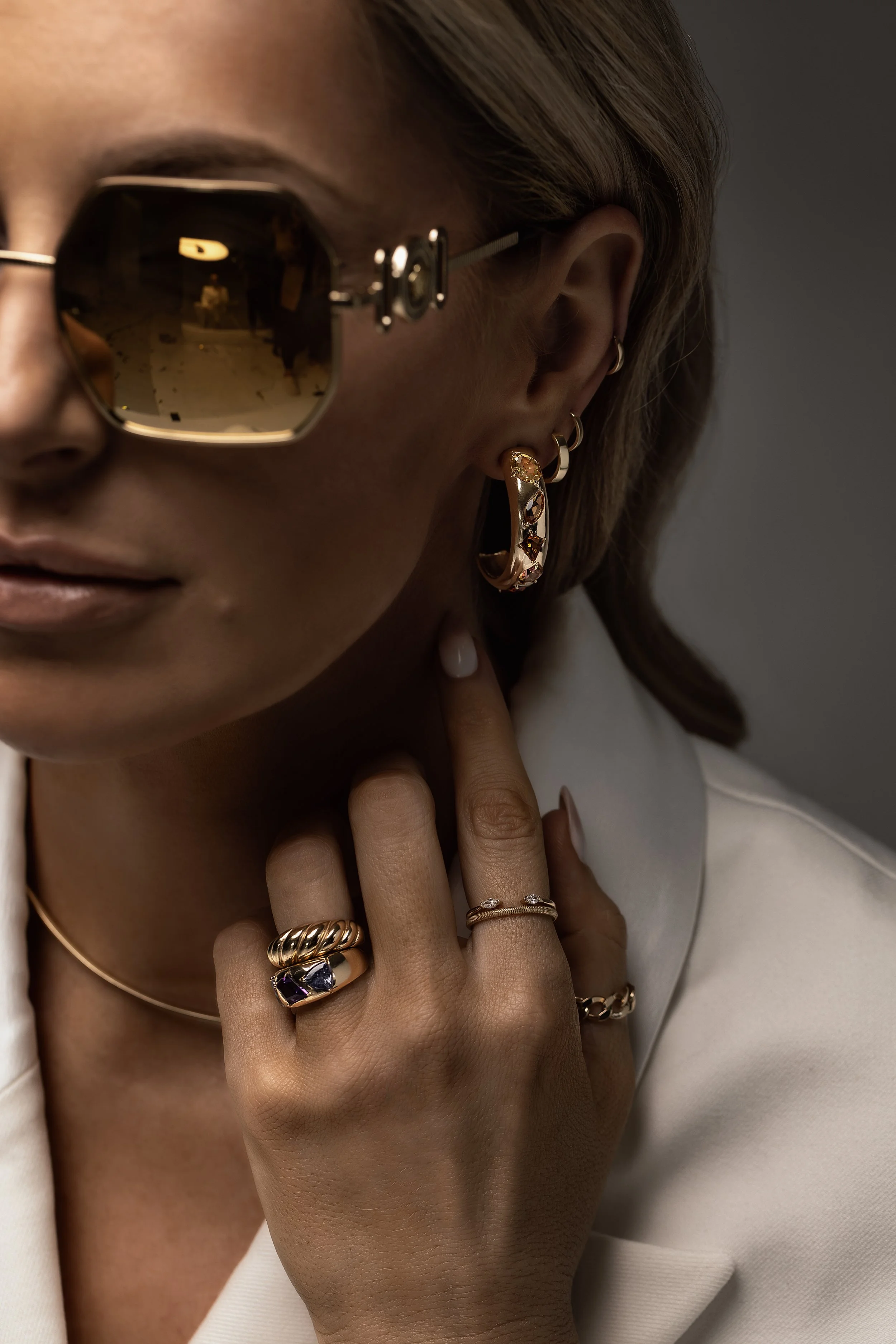 Stylish woman wearing oversized white sunglasses, large hoop earrings, gold jewelry chains, and a white outfit. Close-up portrait in bright lighting.