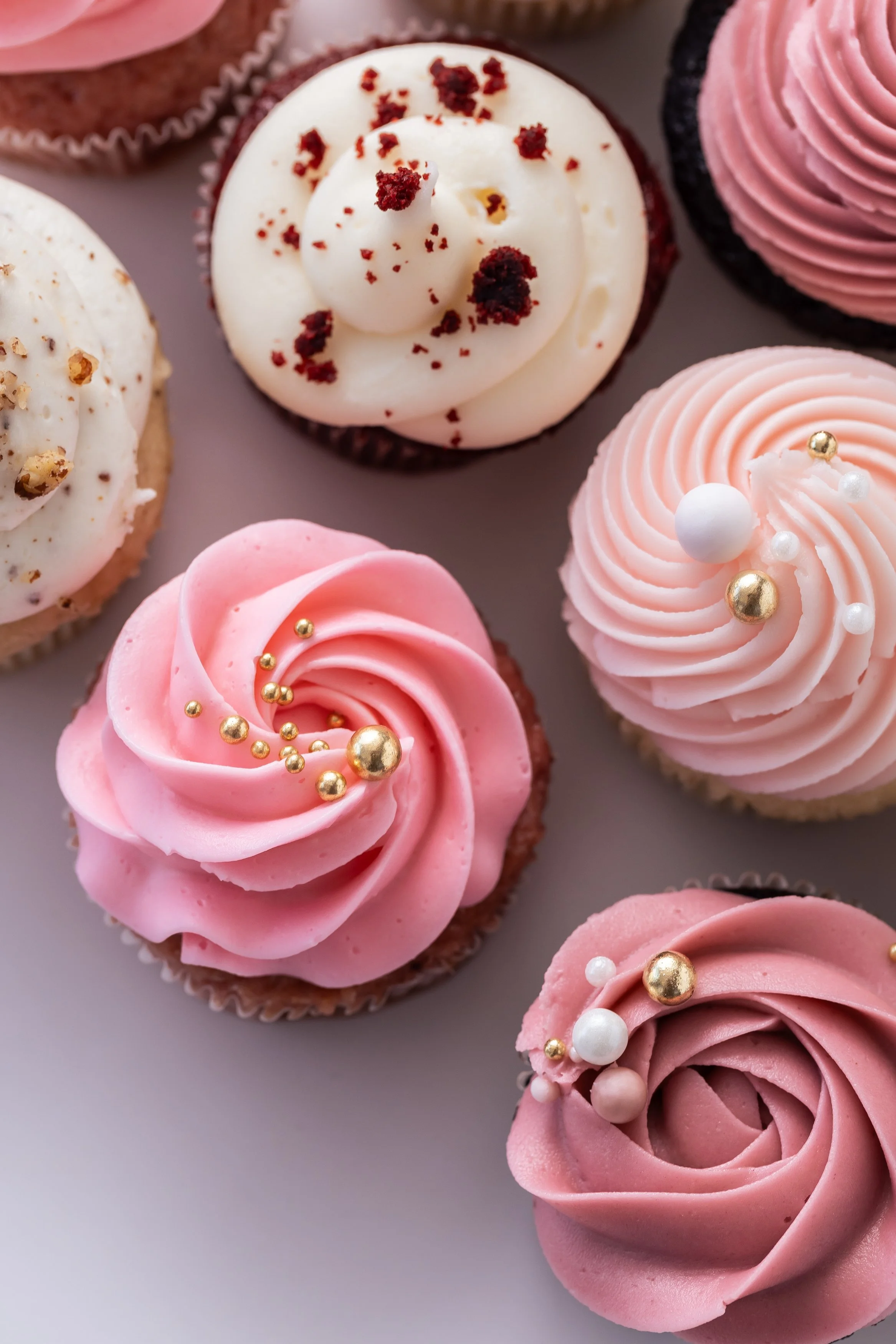 Assorted cupcakes with pink and white frosting, some decorated with gold and pearl-colored sprinkles.